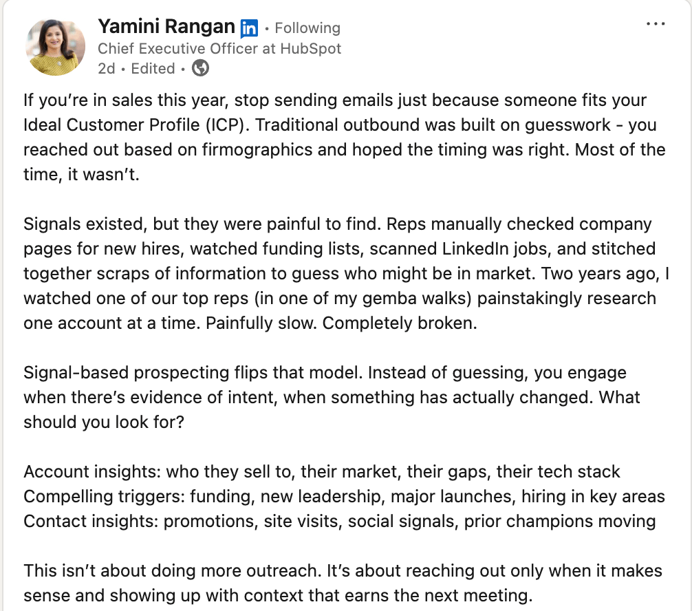 The CEO of HubSpot is basically saying cold TARGETED emailing is not working and wont work again. She believe the future is signal-based prospecting.